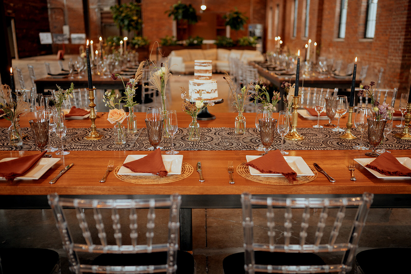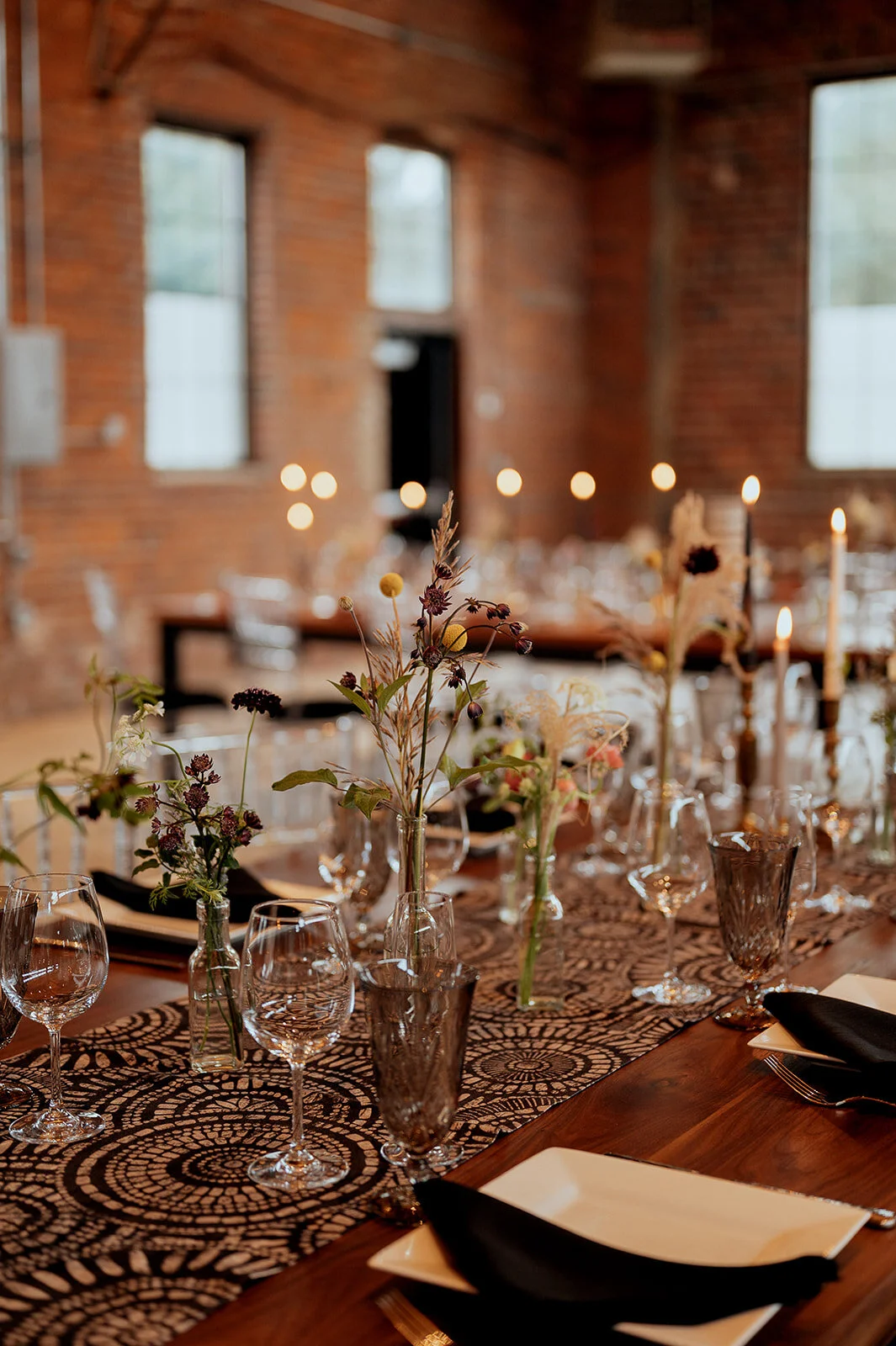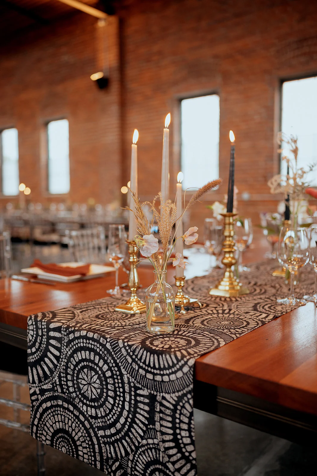 Look 1 had boho and moody vibes with colored candle sticks and glassware, square china, and macrame runners.